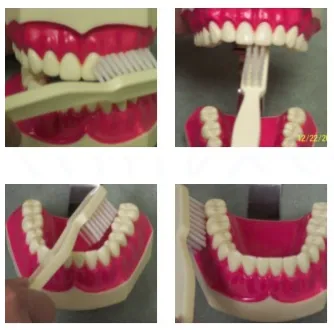Hold the brush at a 45 degree angle toward the teeth and gums. Gently press against the gums so the tips of the bristles go in between the gum and the teeth. Then apply a few lateral strokes and roll the brush down to sweep the plaque away from the teeth and the gum. Repeat this motion 6 to 10 times and move on to the next area of 2 to 3 teeth. If your mouth is full of foam, spit it out and continue brushing. Your brushing is completed when you have brushed all the surfaces of your teeth, not when your mouth is full! On chewing surfaces, short strokes work best to get the plaque out of the grooves and pits. When brushing the back side of your front teeth, hold your brush vertically to be able to reach the teeth better.